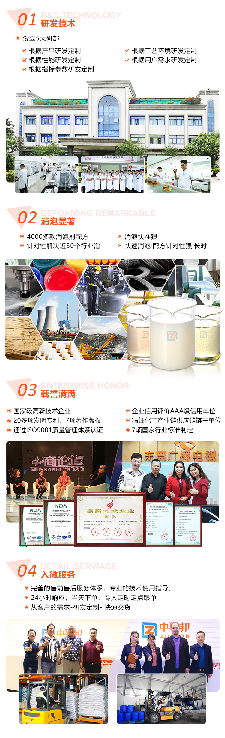 多年來公司面向市場(chǎng),面向真實(shí)各行業(yè)客戶現(xiàn)場(chǎng),對(duì)水處理消泡劑、工業(yè)消泡劑、有機(jī)硅消泡劑、發(fā)酵行業(yè)、清洗劑行業(yè)、金屬加工行業(yè)、造紙行業(yè)、建材行業(yè)、水性粘合劑行業(yè)、紡織印染行業(yè)、油田行業(yè)、水性涂料行業(yè)、印刷材料行業(yè)、電廠脫硫行業(yè)、工業(yè)清洗行業(yè)、家用化學(xué)品行業(yè)、采礦選礦工行業(yè)等32個(gè)行業(yè)工藝、流程及產(chǎn)品配方深入了解,對(duì)各行業(yè)消泡劑應(yīng)用了如指掌,給能客戶提供合適的解決方案,所研發(fā)生產(chǎn)消泡劑適應(yīng)客戶需求和市場(chǎng)需要,能輕松解決客戶遇到的難以解決的消泡難題,減少了客戶使用消泡劑的成本。公司依托完善的售前、售中及售后服務(wù),全程技術(shù)跟進(jìn)消泡劑的試樣到使用過程,節(jié)省了時(shí)間和成本,贏得了業(yè)界各類客戶們的贊譽(yù)!